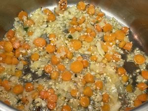 - Add carrots, onion and garlic. Saute until carrots are tender, 4-5 minutes.