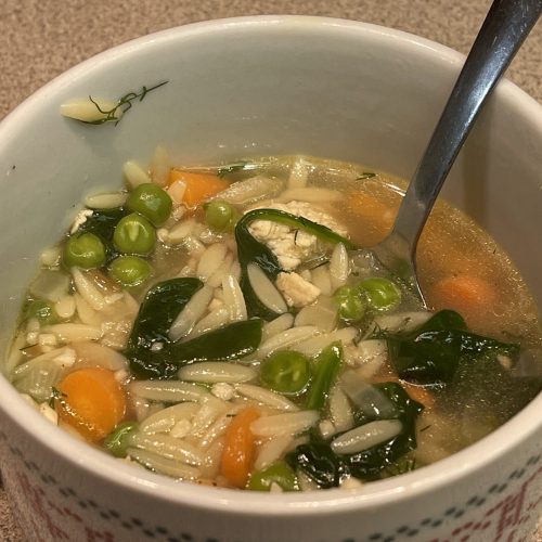 - Stir in broth, chicken, and orzo. Bring to a boil. Reduce heat; simmer, uncovered, 5 minutes.