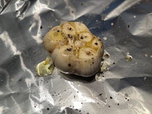 - Halve head of garlic crosswise (as if you’re cutting through the equator) and place on a piece of foil. Drizzle with 1 Tbsp. oil; season with salt and pepper. Fold edges of foil up and over garlic and crimp to close, creating a tight packet. Place on baking sheet with potatoes and roast until a knife slides easily through flesh of potatoes, 65–75 minutes. Let potatoes and garlic cool slightly.