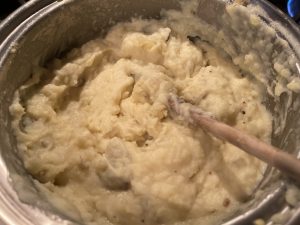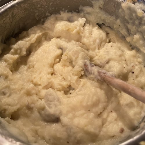 - To serve, warm potatoes over low heat, stirring well with wooden spoon. At this point, if you made it ahead of time, mix in half-and-half mixture floating on top of potatoes.