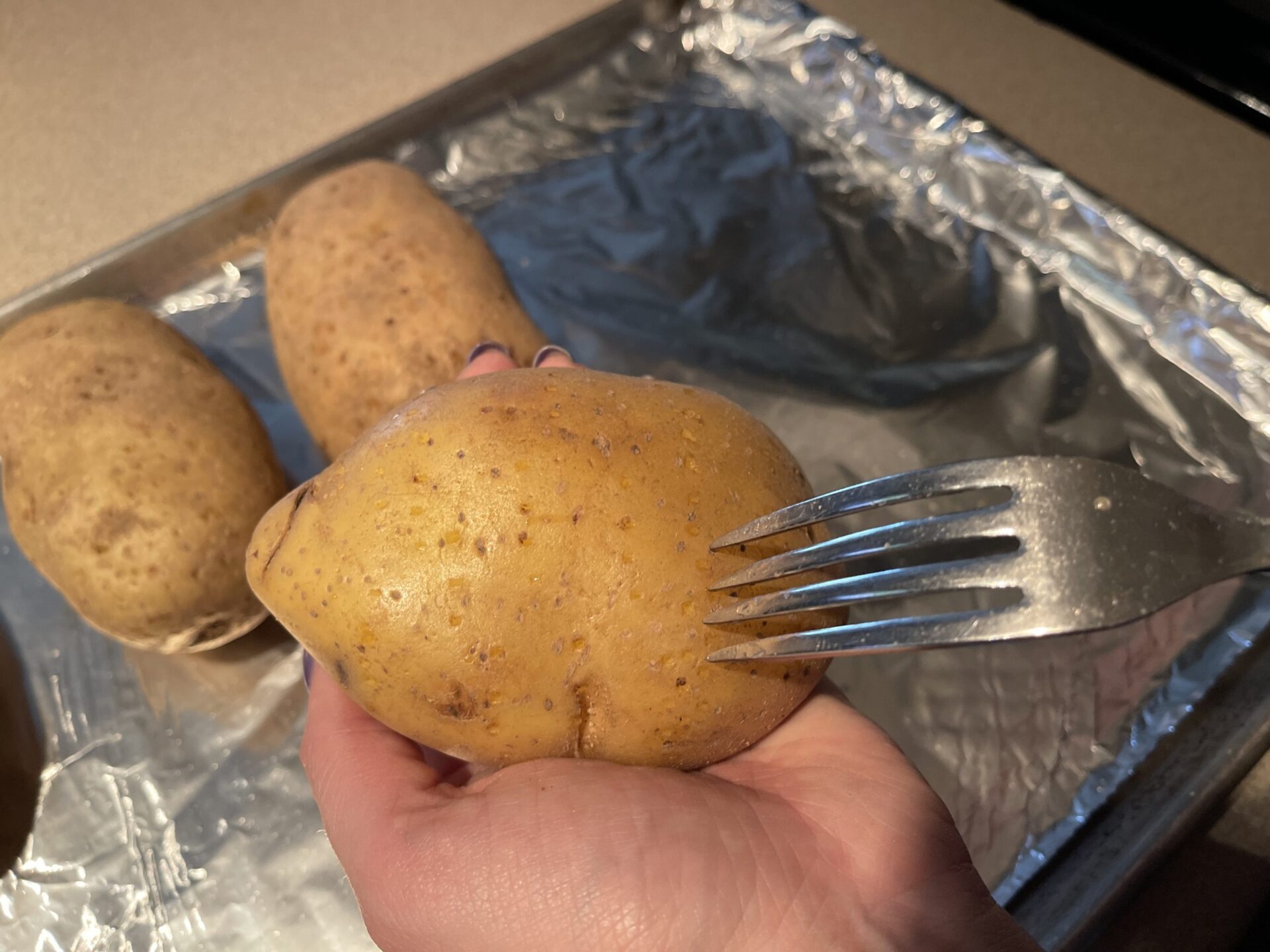 - Arrange a rack in lower third of oven; preheat oven to 425°. Scrub 2 lb. russet potatoes and 2 lb. Yukon Gold potatoes and prick all over with a fork. Place on a foil-lined rimmed baking sheet