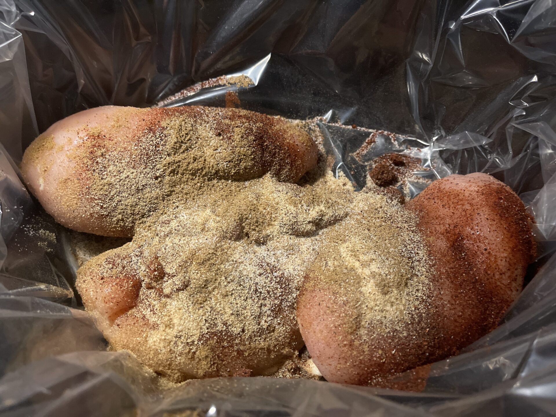 - Place the chicken in the crock pot and season with chili powder, cumin, garlic powder and salt and pepper.