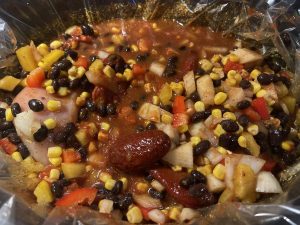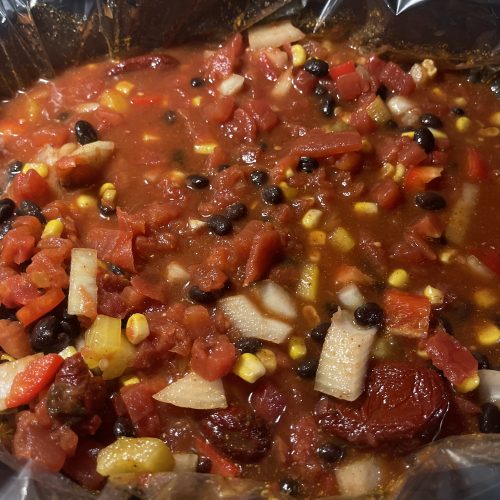 - Add the onion, bell pepper, black beans, corn, tomatoes, chicken broth, tomato paste, chipotle peppers. Stir together.